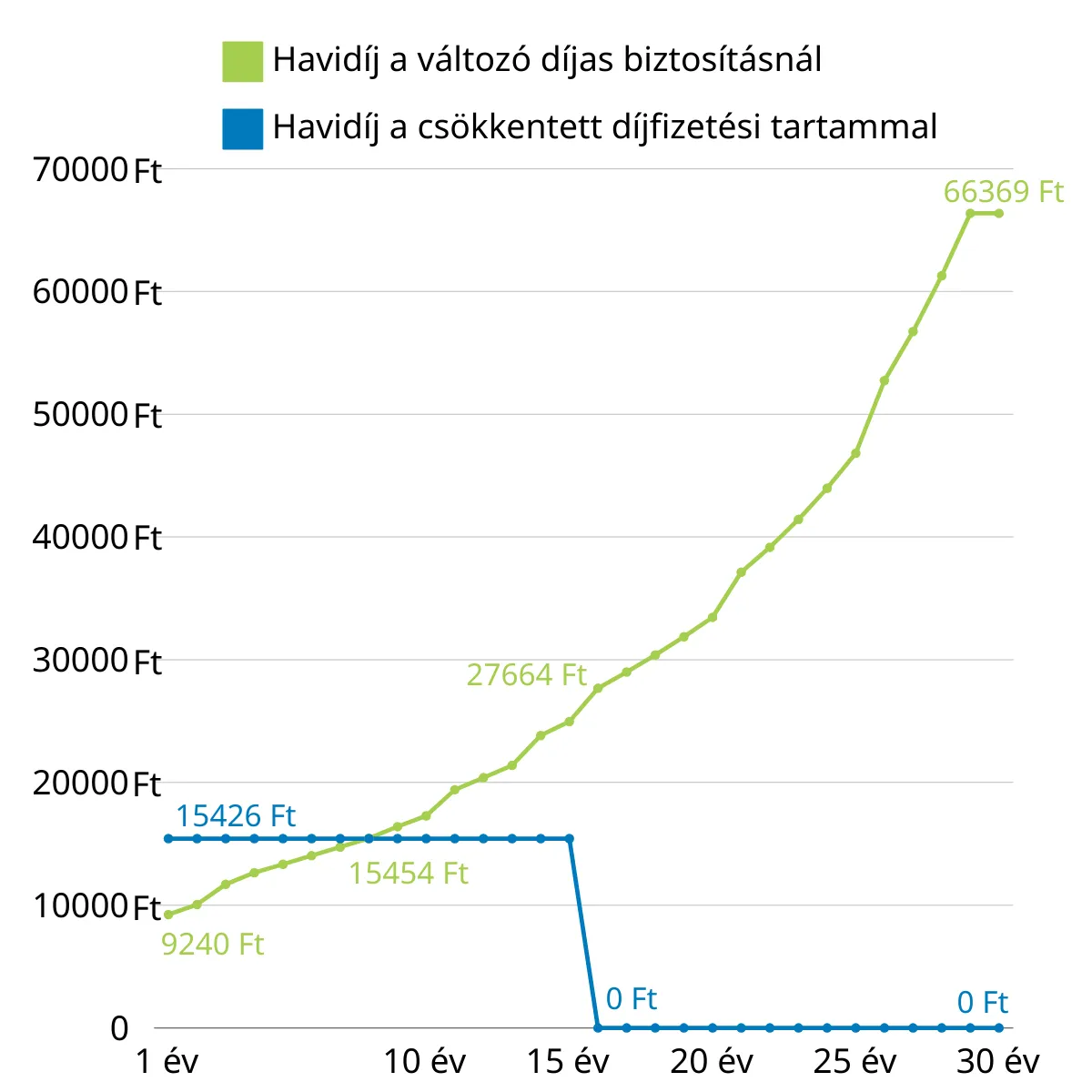 Ha 10 millió forintos biztosítást kötsz 30 évre, akkor a változó díjas biztosítások havidíja 7. évtől jelentősen több lesz, mint a csökkentett díjfizetési tartamú biztosításoké!